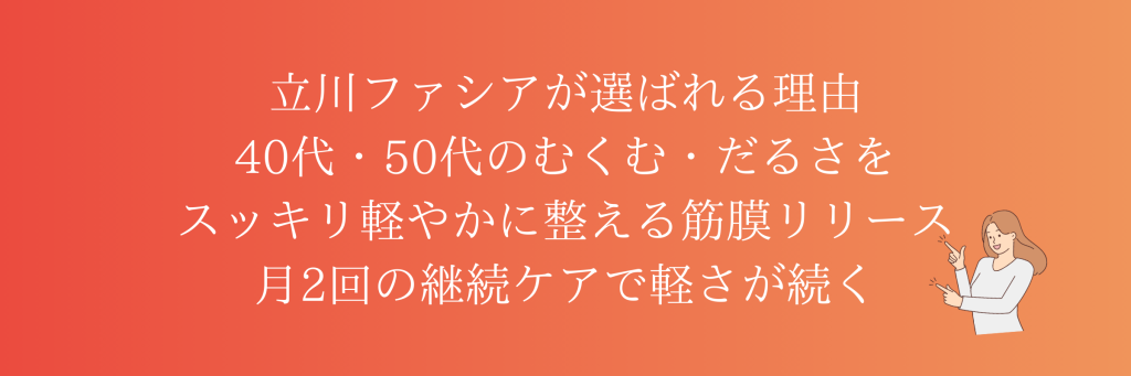 立川市で「筋膜リリース」を専門に行うサロンとして、エステ×整体の両方の良さを実感できます。