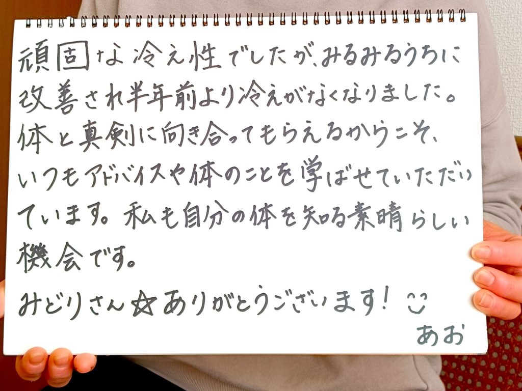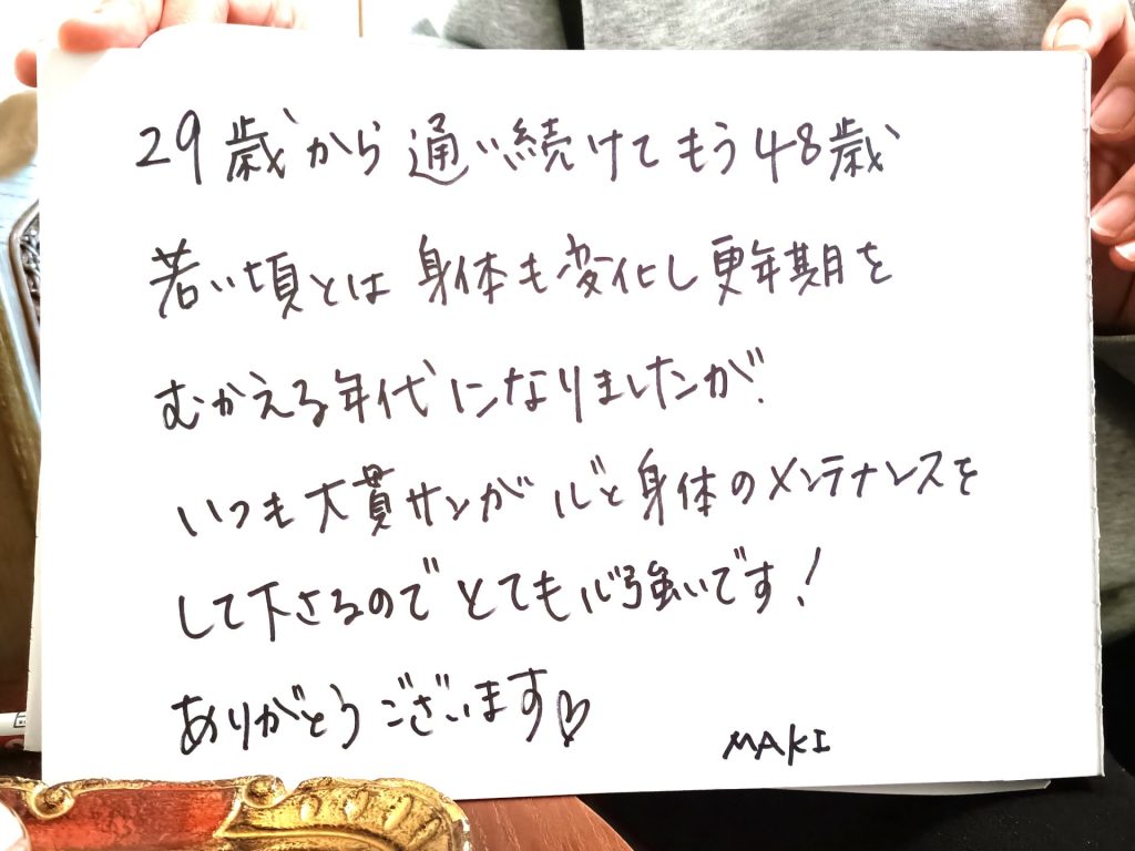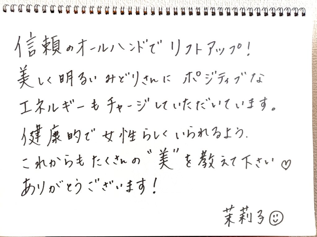 お客様の声 23年 お客様と過ごした時間から生まれた、お客様の『嬉しい変化』の記録です。 29歳から48歳まで、20年近く通い続けてくださるお客様。更年期の変化も、ずっと一緒に歩んでいます。 頑固な冷え性が半年で改善。自分の体を知り、大切にする素晴らしさを一緒に学んでいます。 信頼のオールハンドで顔も心もリフトアップ!ポジティブなエネルギーをもらえる、私にとって大切な場所です! 空き状況・ご予約は下のピンクのボタンをポチッと♫またカレンダーから直接ご予約いただけます。 空き状況・予約 LINEからお問合せは下のボタンを押して下さい